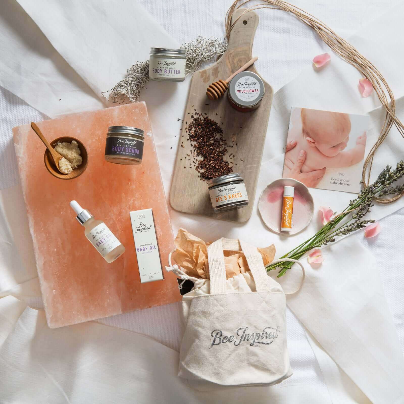 The Mama to Bee set is seven thoughtful things that work together to make her feel human again. Lavender-scented body care that smells like calm, not chemicals. Caffeine-free tea for those rare quiet moments. Honey that tastes like Pennsylvania wildflowers, not the grocery store. And a tote bag that starts as the perfect gift wrap and ends up organizing makeup, travel toiletries, or whatever chaos needs taming.